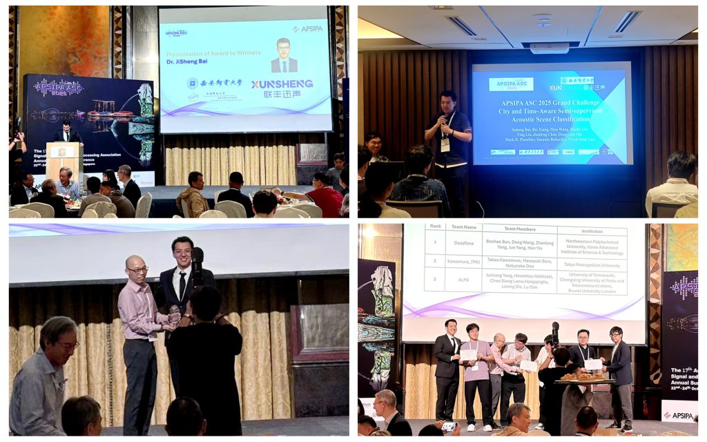 10月22-24日,APSIPA ASC 2025在新加坡香格里拉酒店圆满落幕。由西安邮电大学与西安联丰迅声信息科技有限责任公司主办,中国科学院声学研究所、英国萨里大学、西北工业大学、新加坡理工学院、新加坡南洋理工大学联合协办的挑战赛——城市与时间感知的半监督声学场景分类挑战赛(City and Time-Aware Semi-supervised Acoustic Scene Classification)圆满完赛!