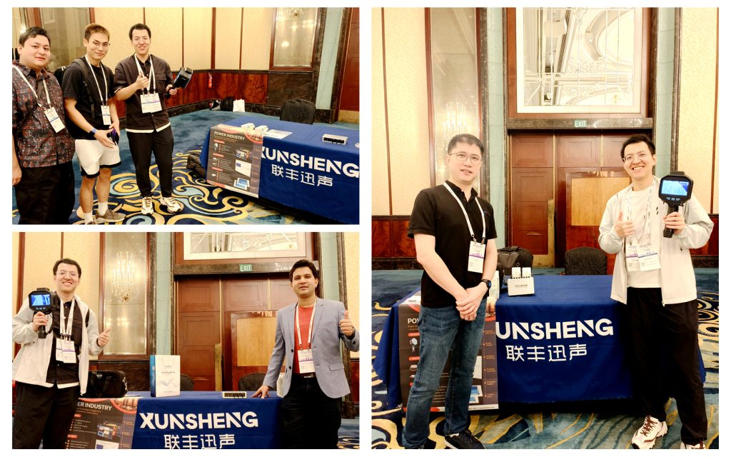 会议同期展览中,联丰迅声重点展示了SC-6X系列手持式声学成像仪与工业声纹分析引擎等声学AI创新产品。APSIPA 主席 Woon-Seng Gan 教授、中国科学院声学研究所杨军研究员、新加坡ASTAR的Yan Wu博士、Fortmedia的Rohan Kumar Das博士等专家参观了展台,并就技术应用进行了交流。